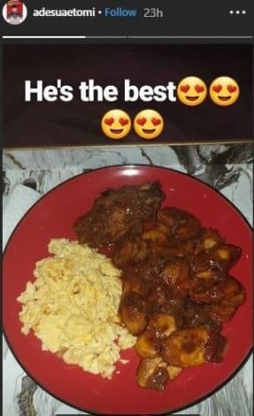 Nollywood actress, Adesua Etomi took to her Instastory to flaunt the appetite–arousing meal.