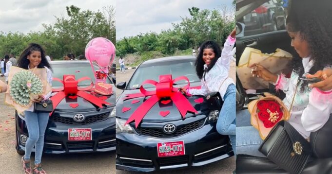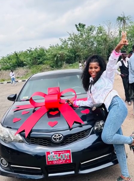 The video captured the lady’s excitement and unbelievable gesture when her man gifted her a black Toyota car amid her sign-out celebration. Massive jubilation ensued as other graduates emerged to film and congratulate the lady.