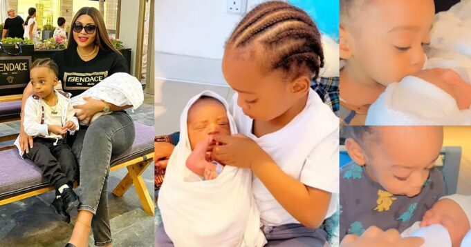 Taking to her Instagram page, the billionaire wife shared a video montage of her first son, Munir, and his baby brother, Khalifa. The lovely videos showed 2-year-old Munir already taking up brother duties.