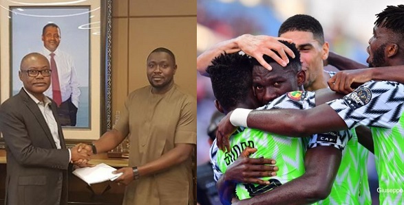 ‘Business tycoon Aliko Dangote today in Lagos redeemed his pledge of $50,000 to the @NGSuperEagles for their one goal against Algeria in AFCON 2019 semi-final. Money was presented by Olakunle Alake, GMD of Dangote Group accompanied by Anthony Chiejina, Chief Corp. Comm. Officer. The team was represented by John Ogu, Team Admin. Enebi Achor and Kit manager Chidi Ngoka,’