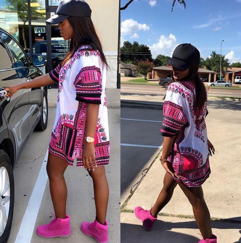 The award winning singer can be seen rocking a pink Dashiki and a pink Timberland boots as she sets to go out…. She’s breathtaking!