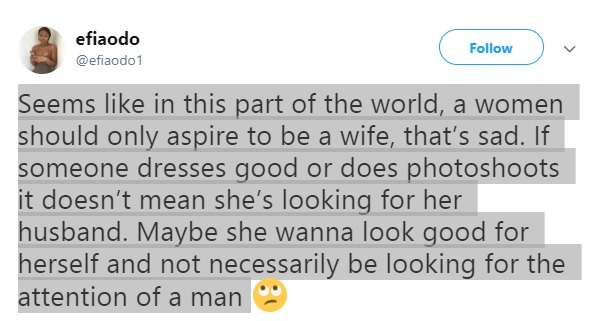 Seems like in this part of the world, a women should only aspire to be a wife, that’s sad. If someone dresses good or does photoshoots it doesn’t mean she’s looking for her husband. Maybe she wanna look good for herself and not necessarily be looking for the attention of a man