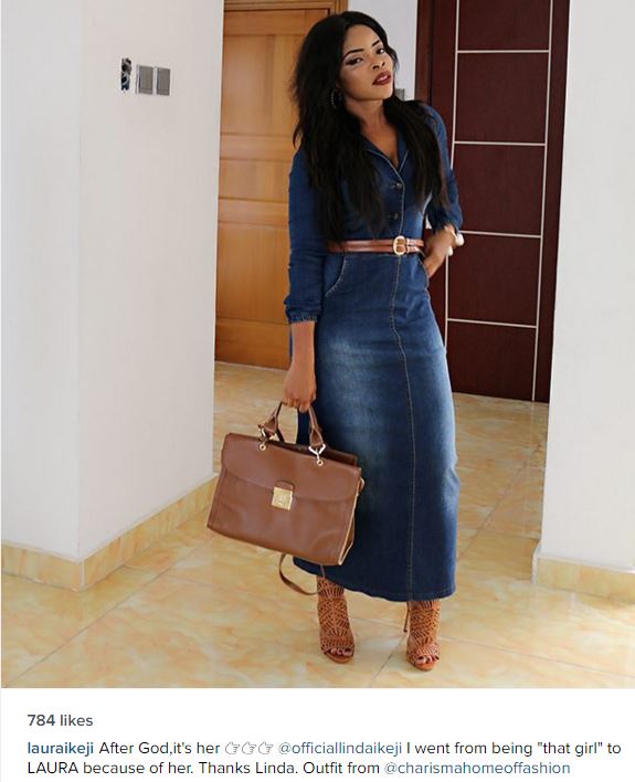 After God,it’s her @officiallindaikeji I went from being “that girl” to LAURA because of her. Thanks Linda. Outfit from @charismahomeoffashion