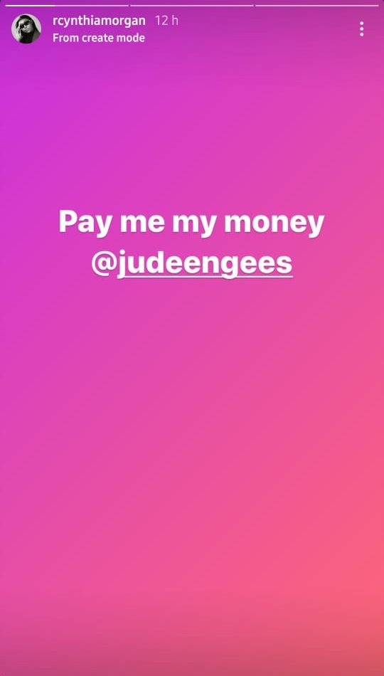 This comes just some days after the songstress took to her official Instagram page and went live on the platform, to rant about Jude. In the video, Morgan seems to be pissed over the fact that her former record label executive stated that she owes him money, whereas she doesn’t. As can be heard, Cynthia says “Jude came online to tell everyone that she owes him money and she doesn’t”.