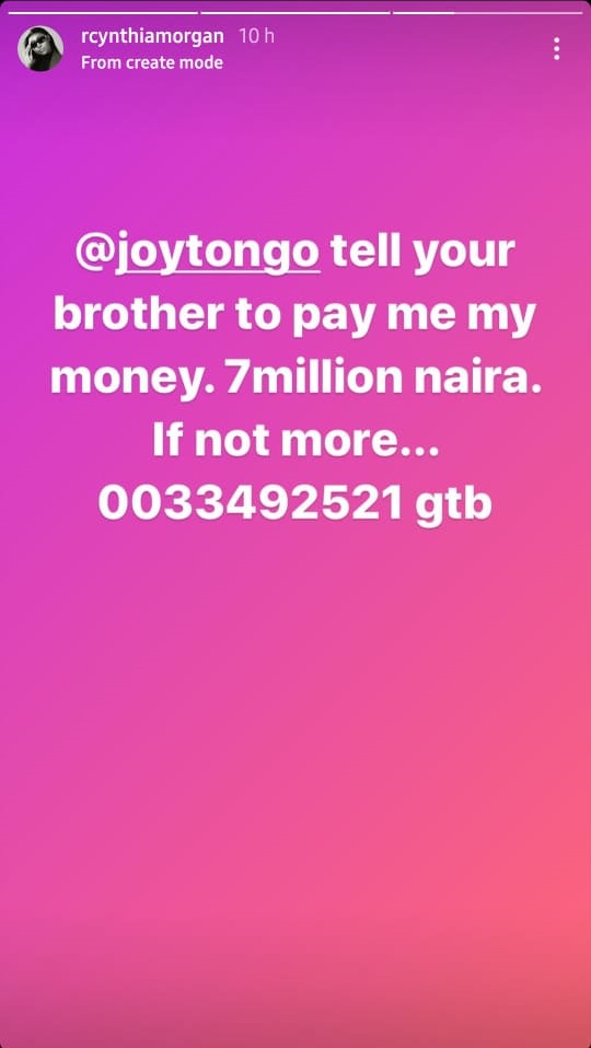 It appears the feud between Nigerian singer, Cynthia Morgan and her former record label boss, Jude Okoye is a never ending one as she’s taken to her Instagram page to yet again beckon on him to pay the money he owes her.