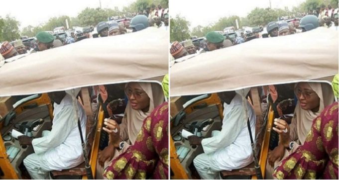 This photo of the Wife of the President, Hajiya Aisha Buhari, who was seen inside a tricycle popularly called “Keke Napep” has since been making rounds online.