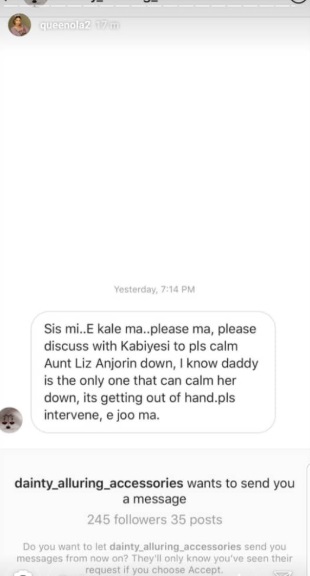 “Please ma. Please discuss with Kabiyesi to calm Aunt Liz Anjorin down. I know daddy is the only one that can calm her down. It’s getting out of hand. Please intervene,” an Instagram user wrote to Olori Ajoke.