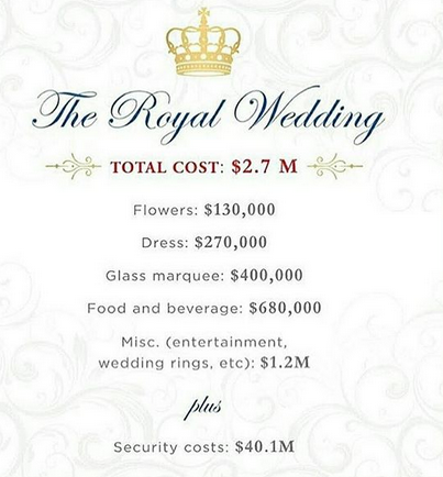 According to unofficial estimates done by UK website Bridebook, Prince Harry and Meghan Markle’s Royal Wedding cost £32M or $43m (which is security inclusive) – which is almost nothing compared to Folorunsho Alakija’s son, Folarin who spent an estimated $5M largely on décor, a lavish venue and Robin Thicke for his wedding last year.