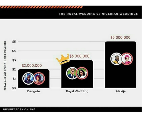 According to unofficial estimates done by UK website Bridebook, Prince Harry and Meghan Markle’s Royal Wedding cost £32M or $43m (which is security inclusive) – which is almost nothing compared to Folorunsho Alakija’s son, Folarin who spent an estimated $5M largely on décor, a lavish venue and Robin Thicke for his wedding last year.