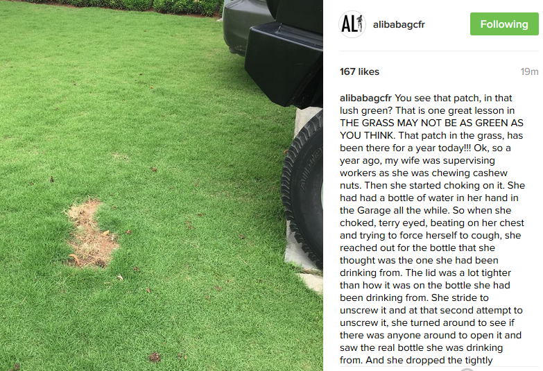 You see that patch, in that lush green? That is one great lesson in THE GRASS MAY NOT BE AS GREEN AS YOU THINK. That patch in the grass, has been there for a year today!!! Ok, so a year ago, my wife was supervising workers as she was chewing cashew nuts. Then she started choking on it.