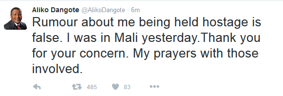 Following the reports of 170 hostages being held by Jihadists at Radisson Blu hotel, Bamako Mali, social media was flooded with reports that Africa’s richest man, Aliko Dangote, was also caught up in the siege.