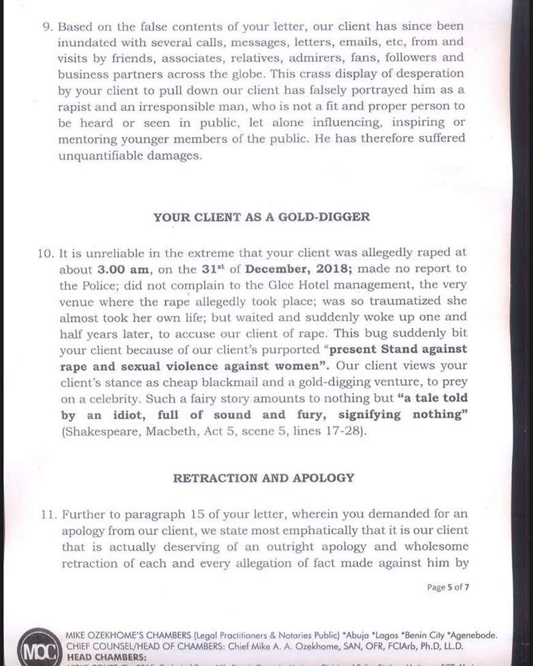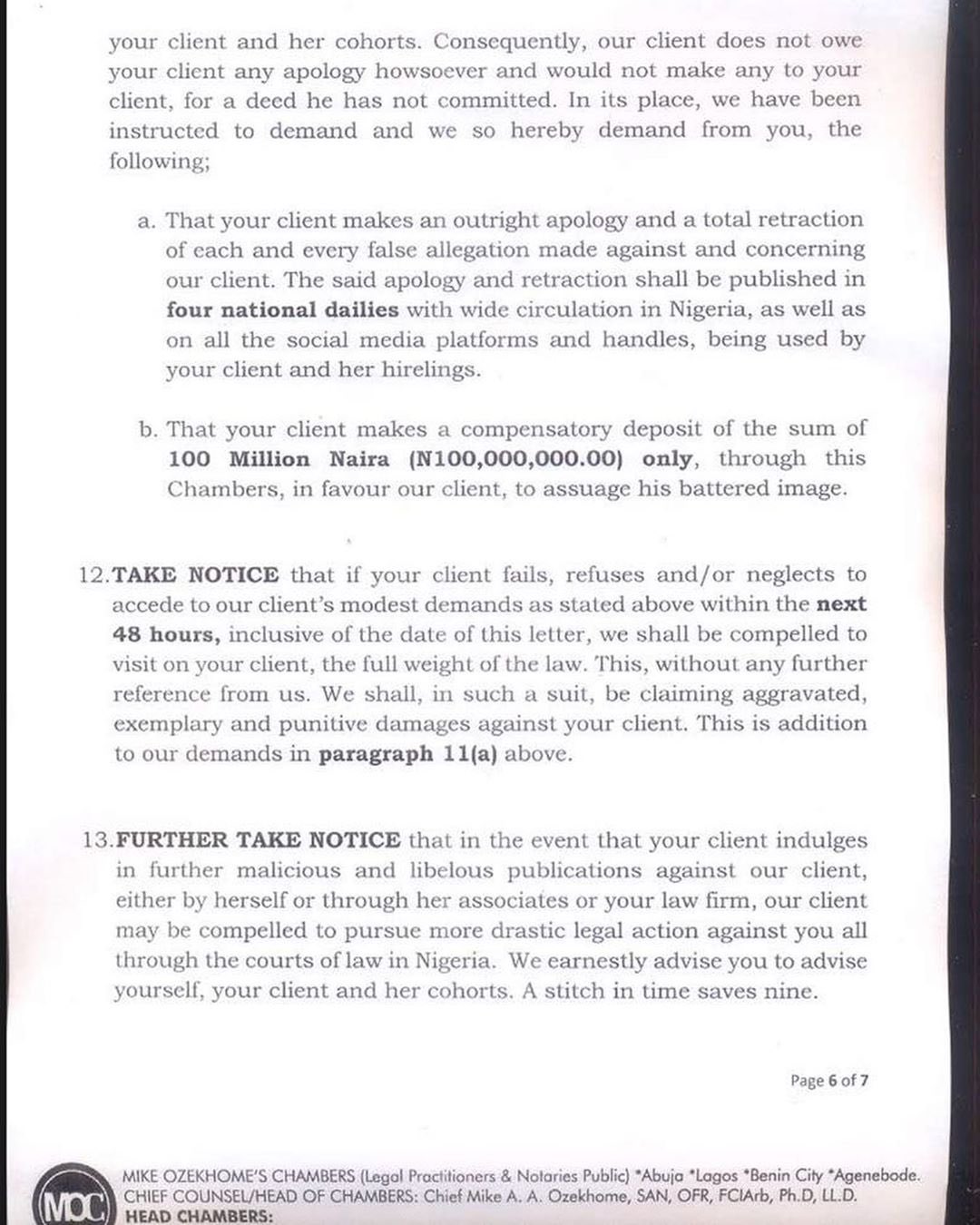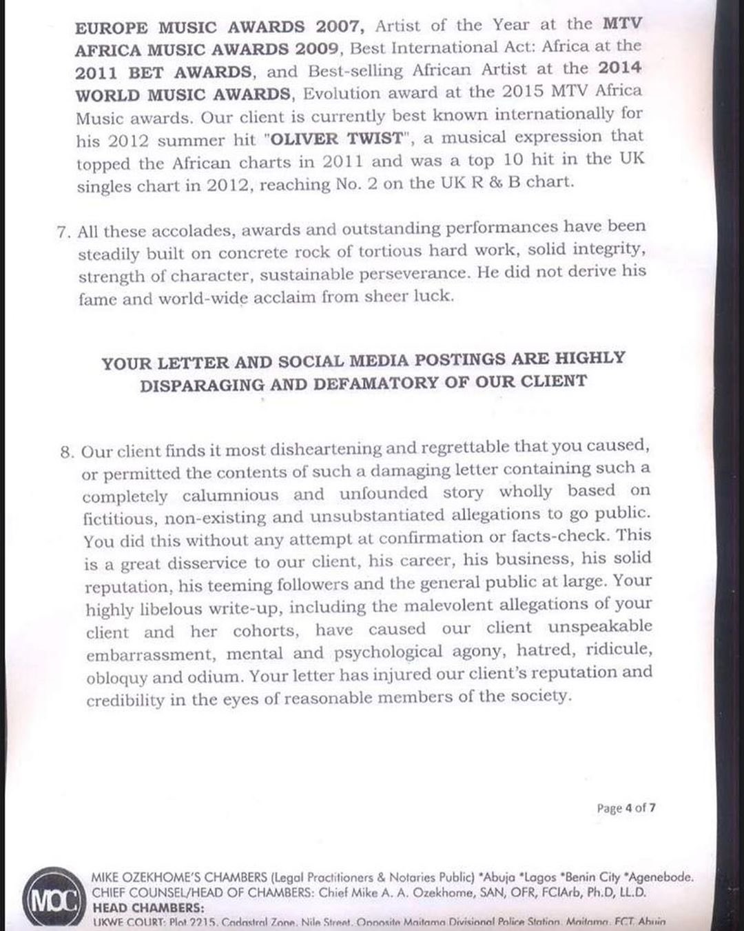 The multiple award-winning singer made the demand in a pre-litigation letter signed by his lawyer, Chief Mike Ozekhome (SAN).
