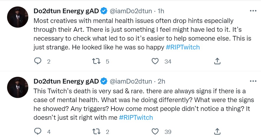 “This Twitch’s death is very sad & rare. there are always signs if there is a case of mental health. What was he doing differently? What were the signs he showed? Any triggers? How come most people didn’t notice a thing? It doesn’t just sit right with me. #RIPTwitch