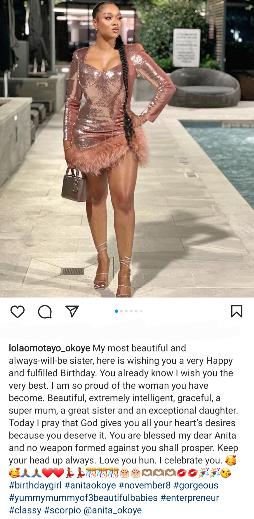 Lola Omotayo shared a stunning photo of Anita in a shimmering dress on her Instagram page and noted that they’ll always be sisters.