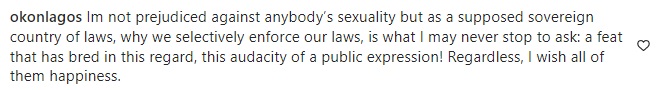 Actor Okon Lagos then chipped in his two cents on the fight and he said that while he isn’t against anybody’s sexuality, it is surprising that Nigeria selectively enforces Law.