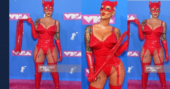 Amber Rose showed up to the 2018 VMAs yesterday dressed as a catwoman, wearing a red latex leotard that connected via garter straps to matching knee-high boots.