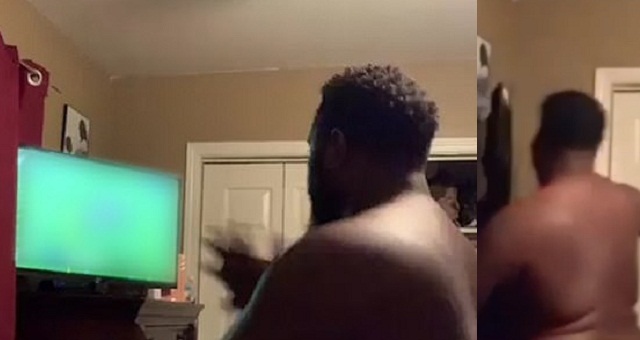 As he launches his fist at the flat screen television, the screen drops to the floor and shatters.
