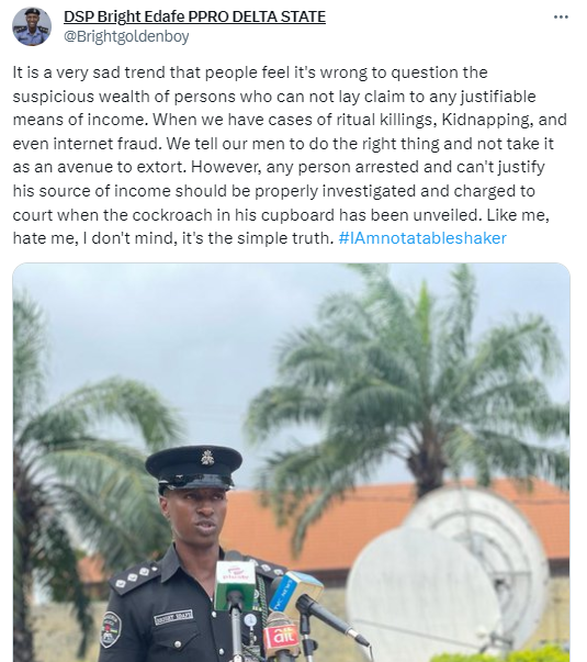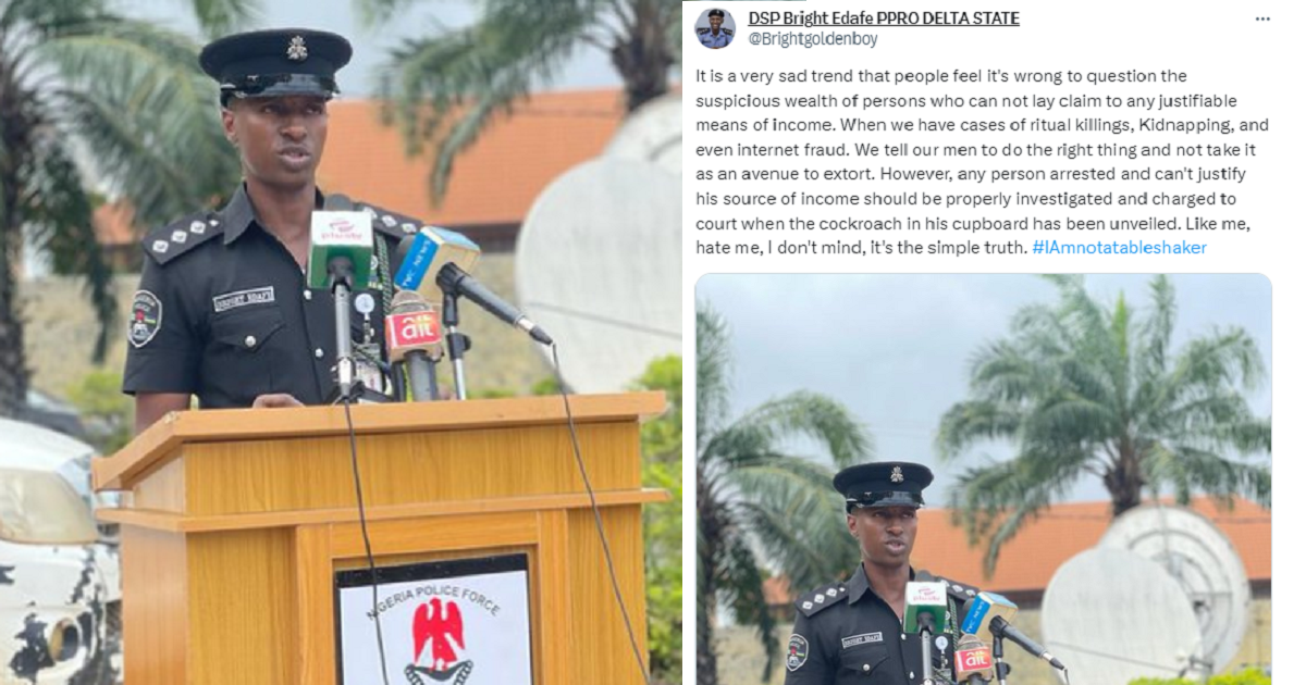 The spokesperson for the Delta State Police Command, DSP Bright Edafe, has called for the thorough investigation and prosecution of individuals who possess unexplainable wealth.