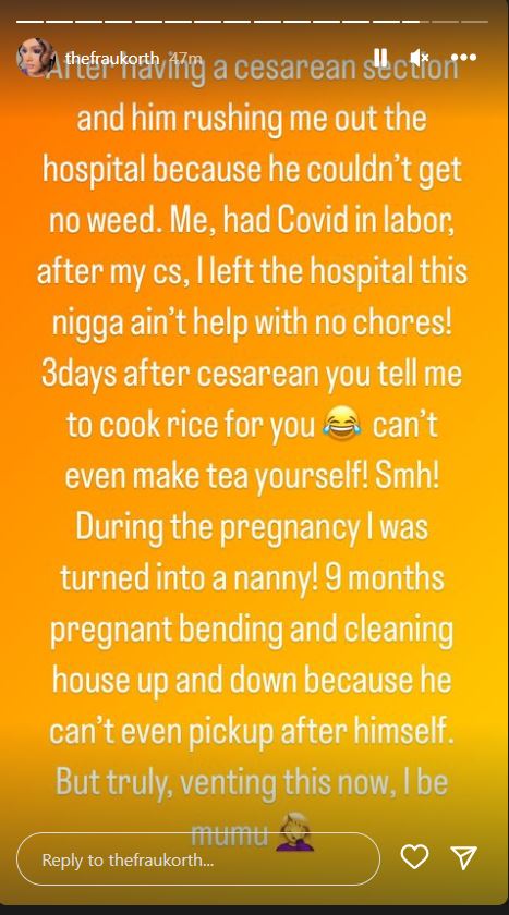 “I, truly tired, No we cant take this anymore. He doesn’t even respect my mom. She go talk her own later. Cant even provide finncially for the house. But can always buy weed o. Chai na me mumu sha.