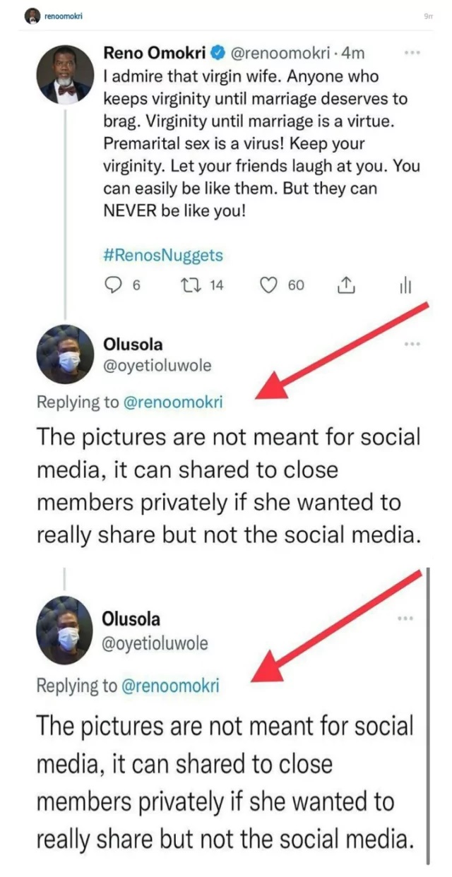 Social media influencer, Reno Omokri has defended the bride who went viral after bragging about being a virgin till she got married and losing it to her husband alone.