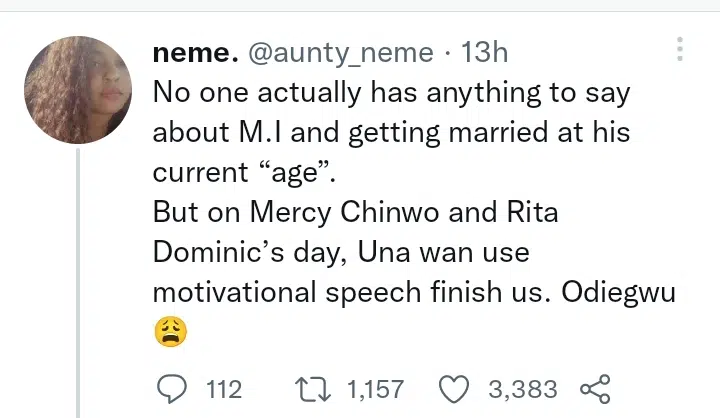 “No one actually has anything to say about M.I and getting married at his current “age”. But on Mercy Chinwo and Rita Dominic’s day, Una wan use motivational speech finish us. Odiegwu”. She wrote on Twitter.