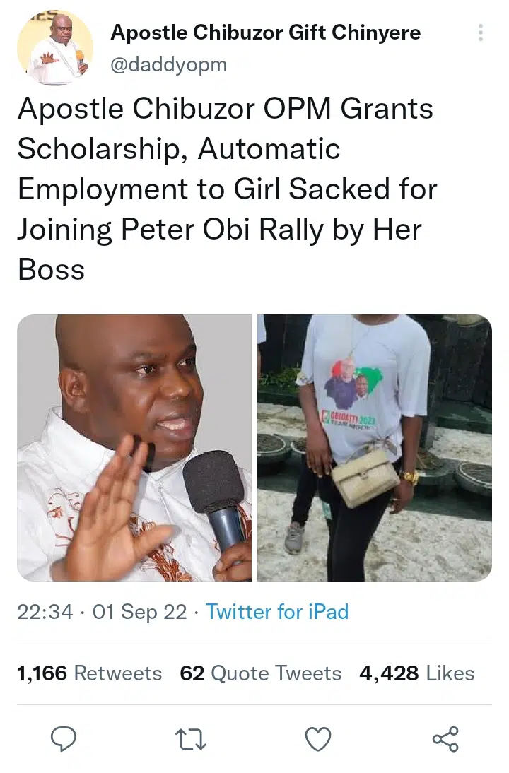 “Apostle Chibuzor OPM Grants Scholarship, Automatic Employment to Girl Sacked for Joining Peter Obi Rally by Her Boss”. He wrote on Twitter.