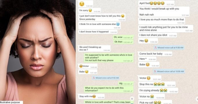 The lady buzzed her beau in the morning of April fool’s day via Instant messaging app, WhatsApp and told him that she was in love with someone else.