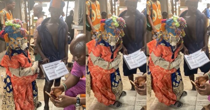 Netizens have expressed surprise spotting the gods of the land receiving transfer humbly. Many stated that the masquerade has upgraded his skills as the gods are now hungry and operating in a cashless society.