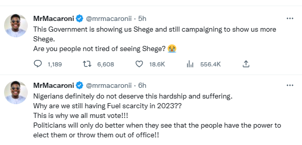 “Nigerians definitely do not deserve this hardship and suffering. Why are we still having Fuel scarcity in 2023?? This is why we all must vote!!! Politicians will only do better when they see that the people have the power to elect them or throw them out of office!!