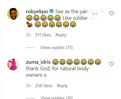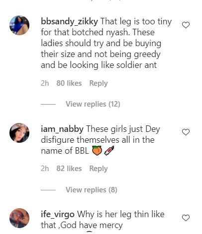@sabiboy235 wrote, “I am not against plastic surgery, but if you want to do it do it right. The other side of her hips and in between her looks like they need help”.