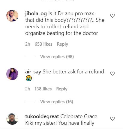However, netizens are not impressed with her new body and has taken to social media to drag her to filth. Many advised her to ask her doctor for a refund as the cosmetic surgery she underwent was not properly done because her hips and butt looks ‘awkward’.