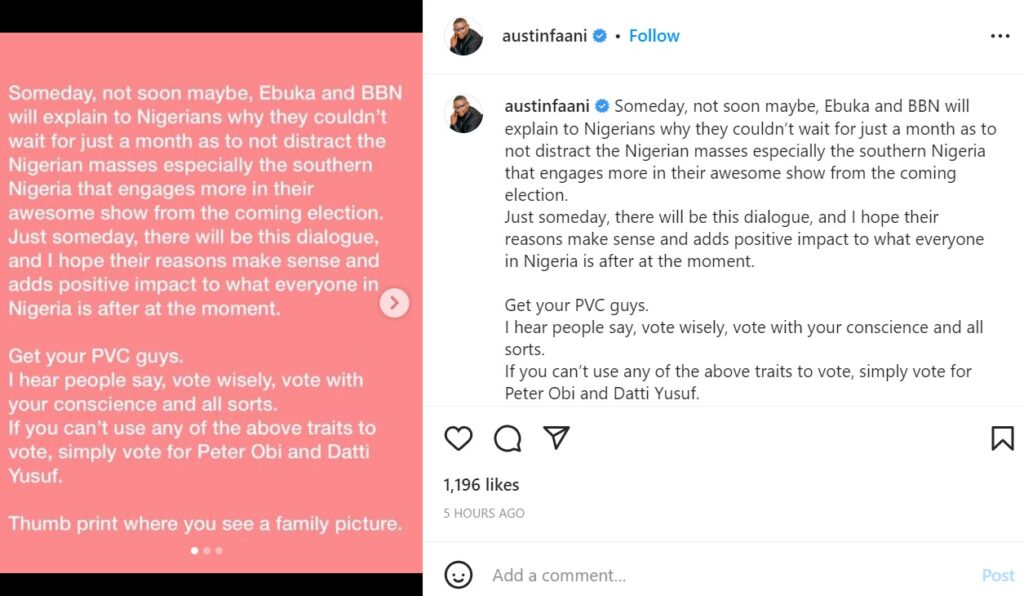 “Someday, not soon maybe, Ebuka and BBN will explain to Nigerians why they couldn’t wait for just a month as to not distract the Nigerian masses especially the southern Nigeria that engages more in their awesome show from the coming election.