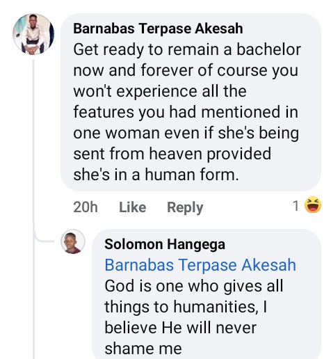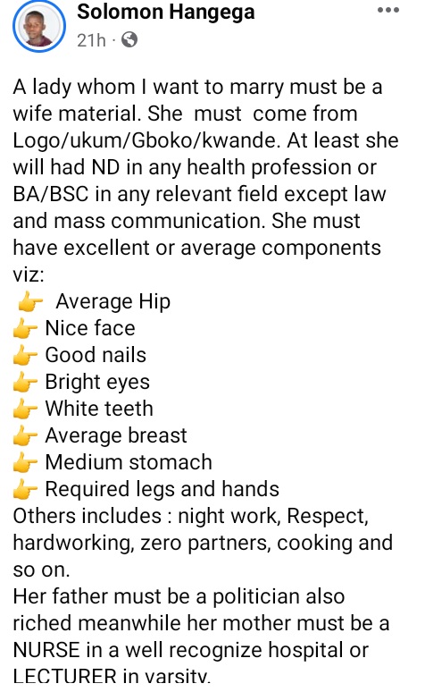 A young man from Benue State, Solomon Hangega, has taken to Facebook to share a humongous list of requirements for his future wife.