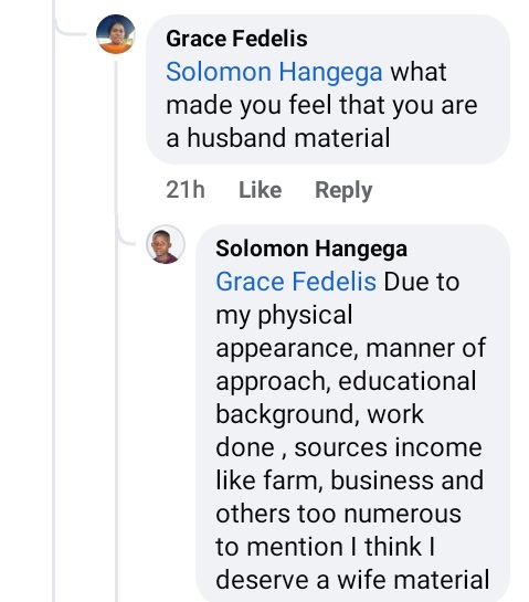 In response, he said, “Due to my physical appearance, manner of approach, educational background, work done , sources income like farm, business and others too numerous to mention I think I deserve a wife material”