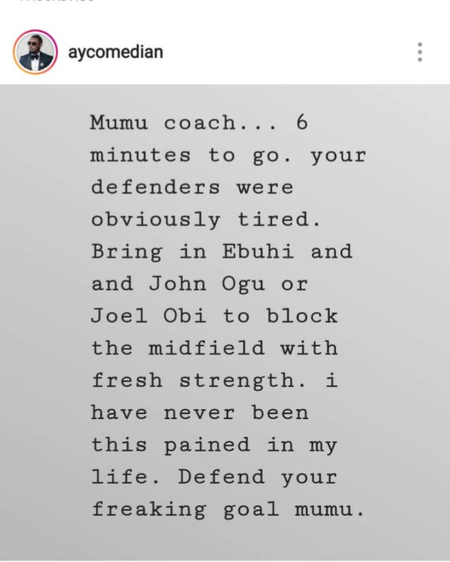 Ace Nigerian Comedian,  AY Makun like most Nigerians is pissed with the outcome of the Nigeria’s Super Eagles match yesterday.