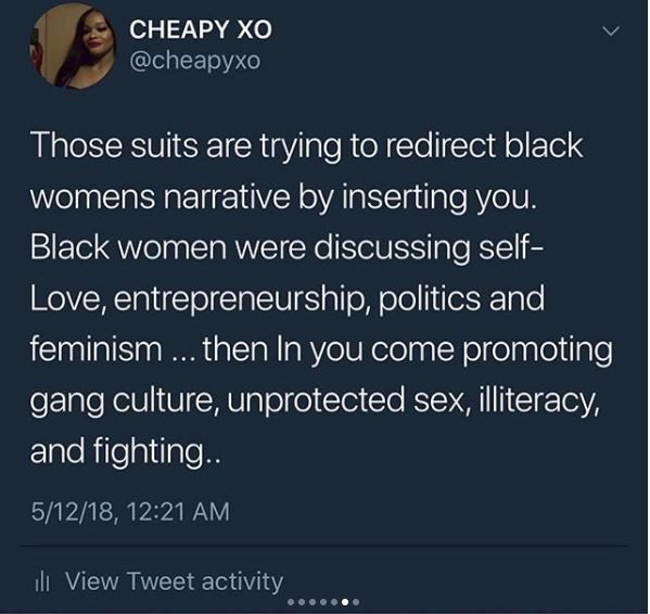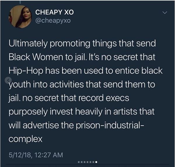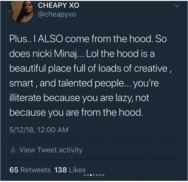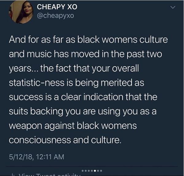 “If my spelling and grammar was that bad I’d be cancelled,” she says. “If Nicki Minaj spelled like that, they’d be ragging on her all day. When it comes to this female rap thing that we have, I don’t understand how we go from Beyoncé and Lemonade and Solange and all these great conversations to like … this. I know we’re not monolithic but come on.