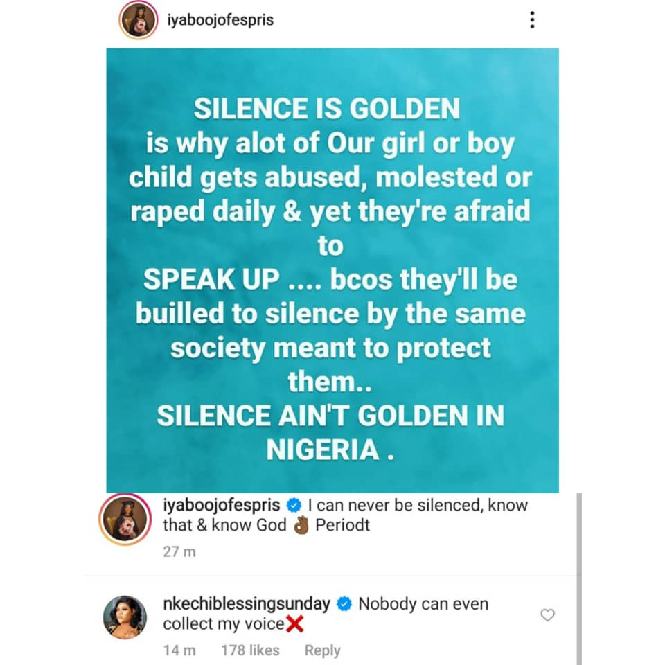 She shared a post about sexually abused children and wrote, “I can never be silenced, know that & know God 👌🏾 Periodt”