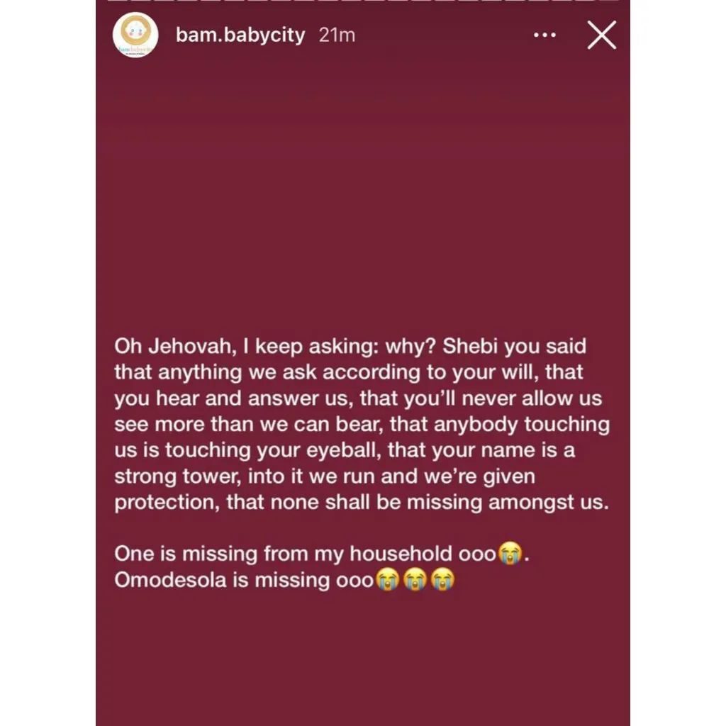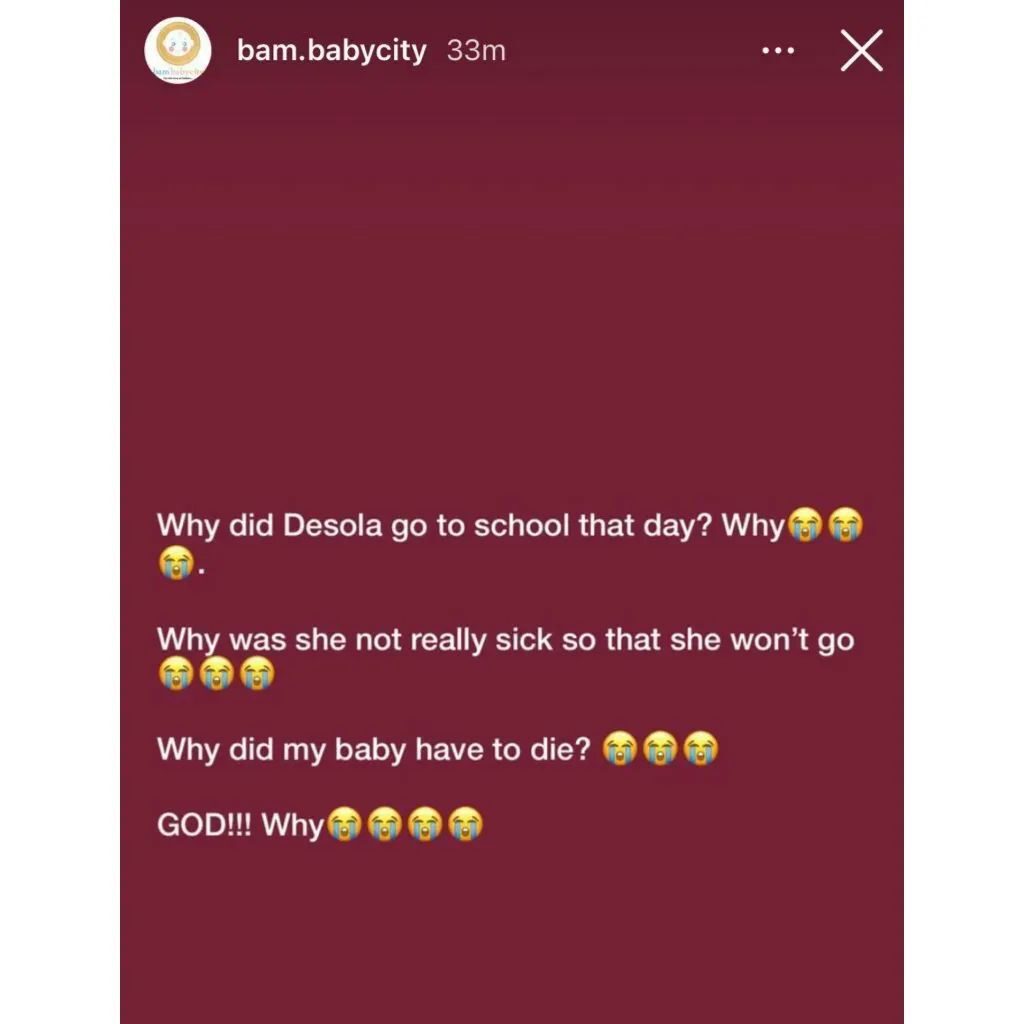 Taking to her Instastory on Tuesday April 11, the distraught mother said she wishes her daughter had not gone to school on that ill-fated day and instead stayed at home. She also blamed God for allowing such a tragedy to befall her family.