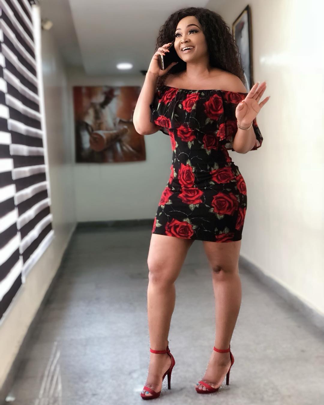 Nollywood actress, Mercy Aigbe is certainly living her best life at 40 – the mother of two showed off her curves in a short, sexy floral dress paired with a black pair of strapped heels.