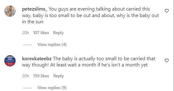 Reacting to the photo, an Instagram follower @petezslims_ wrote, “The baby is too small to be out and about, why is the baby out in the sun”.
