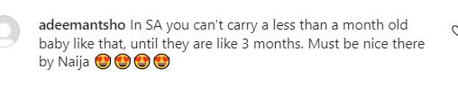 The photo, however, stirred mixed reactions on the photo/video sharing platform. While some followers took to the comments to gush over the photo, others noted that the baby is still too young to be out or be carried with a carrier.
