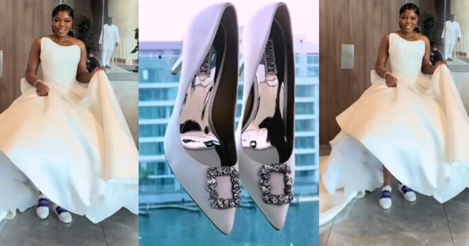 A Nigerian bride was compelled to wear a pair of sneakers underneath her wedding dress despite possessing silver heels as wedding shoes.