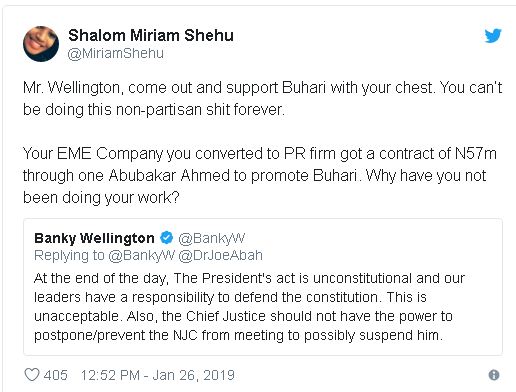 Mr. Wellington, come out and support Buhari with your chest. You can’t be doing this non-partisan shit forever. Your EME Company you converted to PR firm got a contract of N57m through one Abubakar Ahmed to promote Buhari. Why have you not been doing your work?