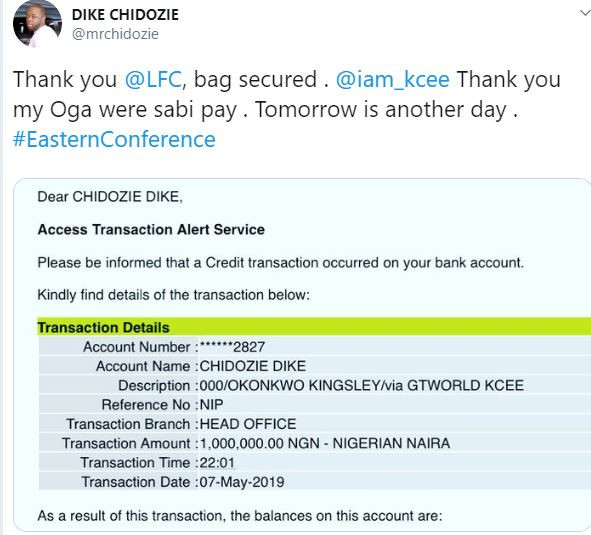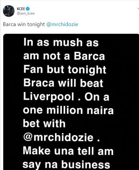 Yesterday, before the ‘big game’, Nigerian singer, Kcee promised to give 1 million naira to a @mrchidozie, a die hard liverpool fan on Twitter, if his team wins.