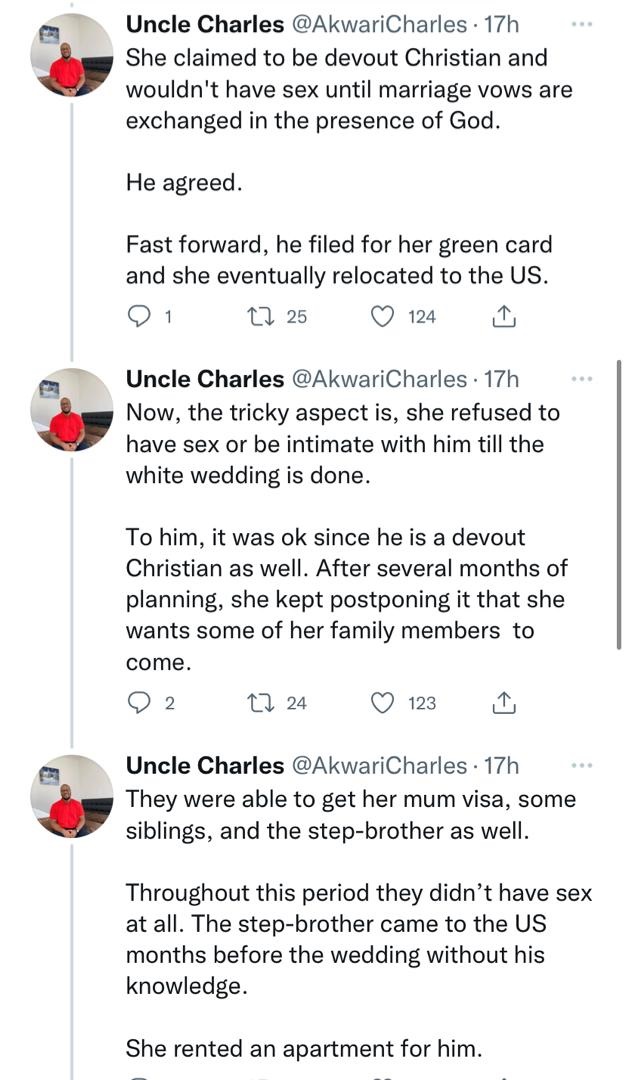 Charles said the lady insisted on having a white wedding in the US and she wanted her family to be present, so she made the man apply for visas for them and brought them to the US.