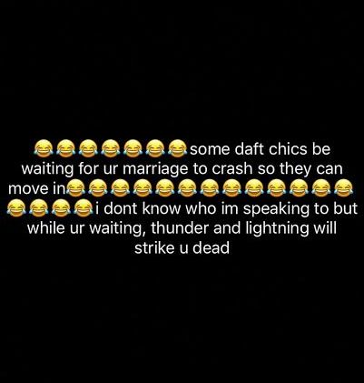 In a post she made on snapchet, she cursed the hell out of such ladies. She wrote: “Some daft chic be waiting for ur marriage to crash so they can move in. I don’t know who im speaking to but while your waiting, thunder and lightening will strike you dead”