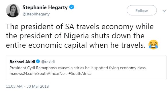 The president of SA travels economy while the president of Nigeria shuts down the entire economic capital when he travels. ? https://t.co/2MYMUT1tAv