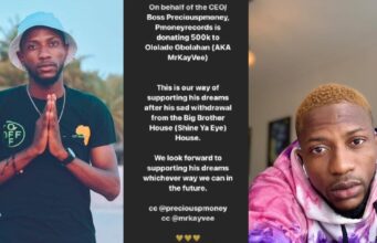 #BBNaija: Record Label donates N500,000 to withdrawn housemate, Kayvee