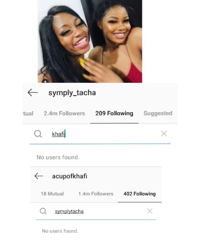 There seem to be an ongoing feud between reality star, Tacha and her best friend, Khafi as they have unfollowed each other on Instagram.