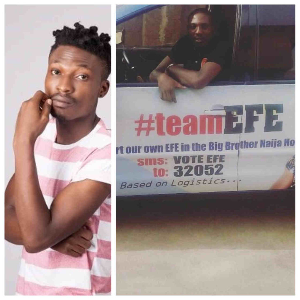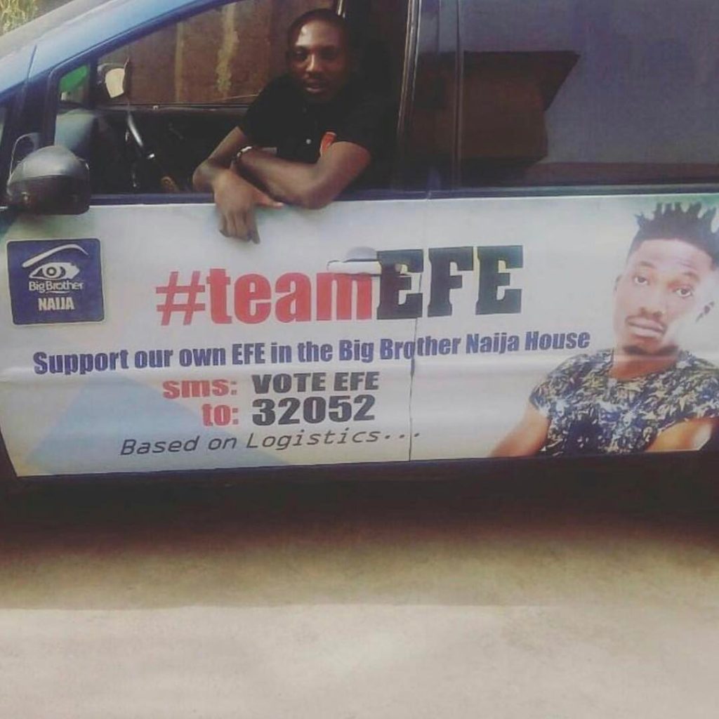 This is a campaign vehicle reportedly gotten to help get votes, for Nigeria’s favourite big brother naija housemate, Efe – the #teamEfe campaign vehicle has the housemate’s photo, and also the number which the votes in form of a text is supposed to go to.